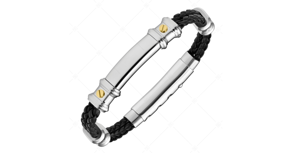 Bracelet en cuir tressé à deux rangs, en 316L médical, avec des pièces et une boucle en acier inoxydable antiallergique, qui est également réglable. Accessoire extrêmement durable avec des ornements plaqué or 18K. Grâce à sa conception, il est facile et confortable à porter, même dans la vie de tous les jours.