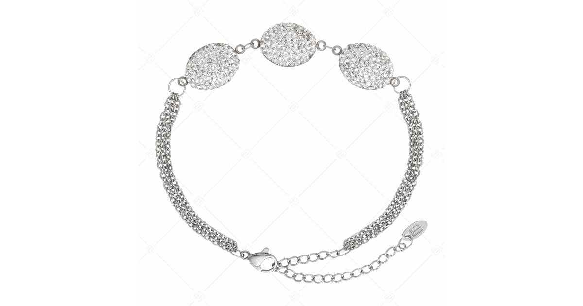 Un bracelet serti de cristaux tchèques clairs et scintillants et décoré de charms ovales. Bracelet à trois rangs de chaînes d'ancre à maillon aplati en acier inoxydable de qualité médicale 316L. Grâce à son matériau, il est extrêmement durable et ne s'usera pas et ne se décolorera pas.