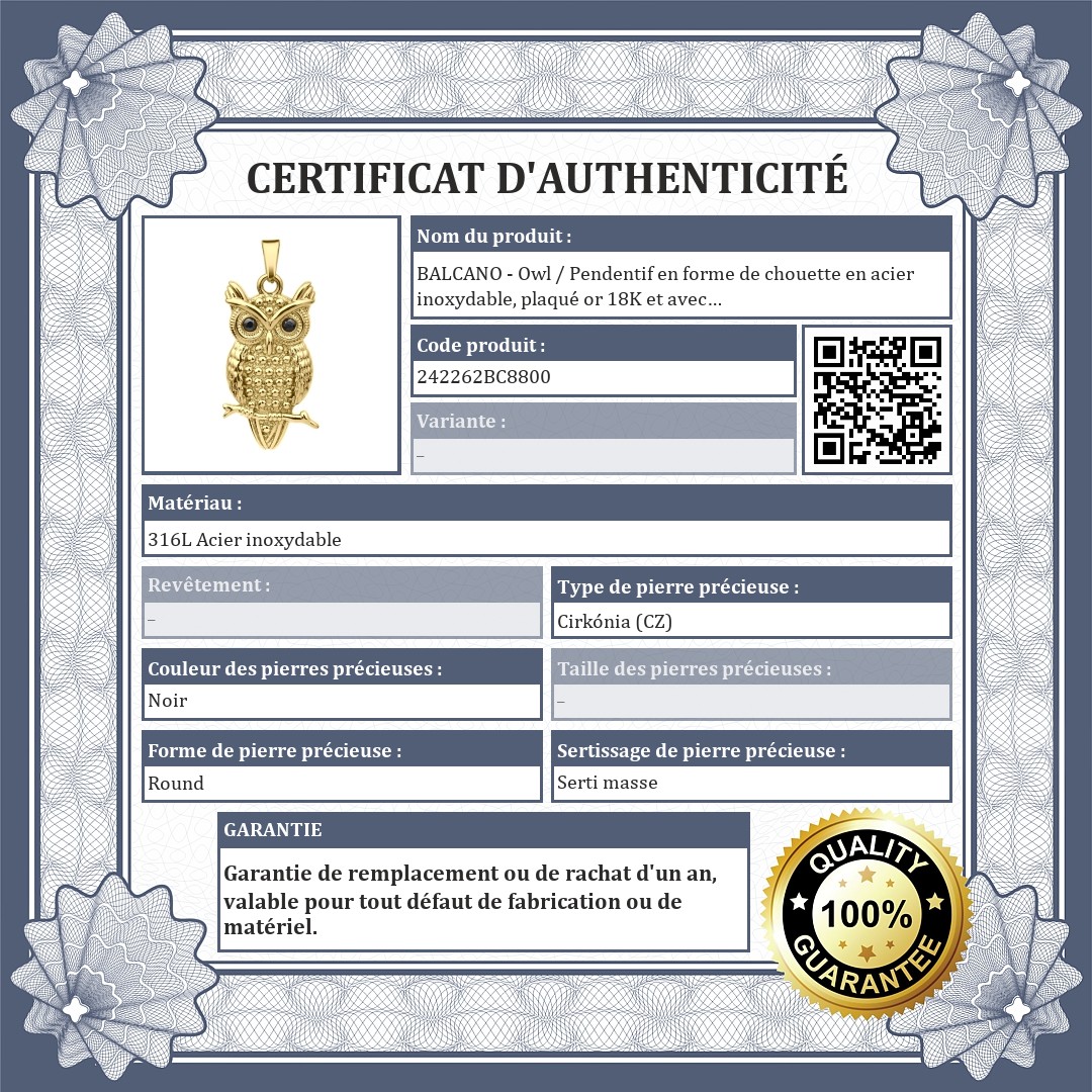 BALCANO - Owl / Pendentif en forme de chouette en acier inoxydable, plaqué or 18K et avec pierres précieuses en zircone