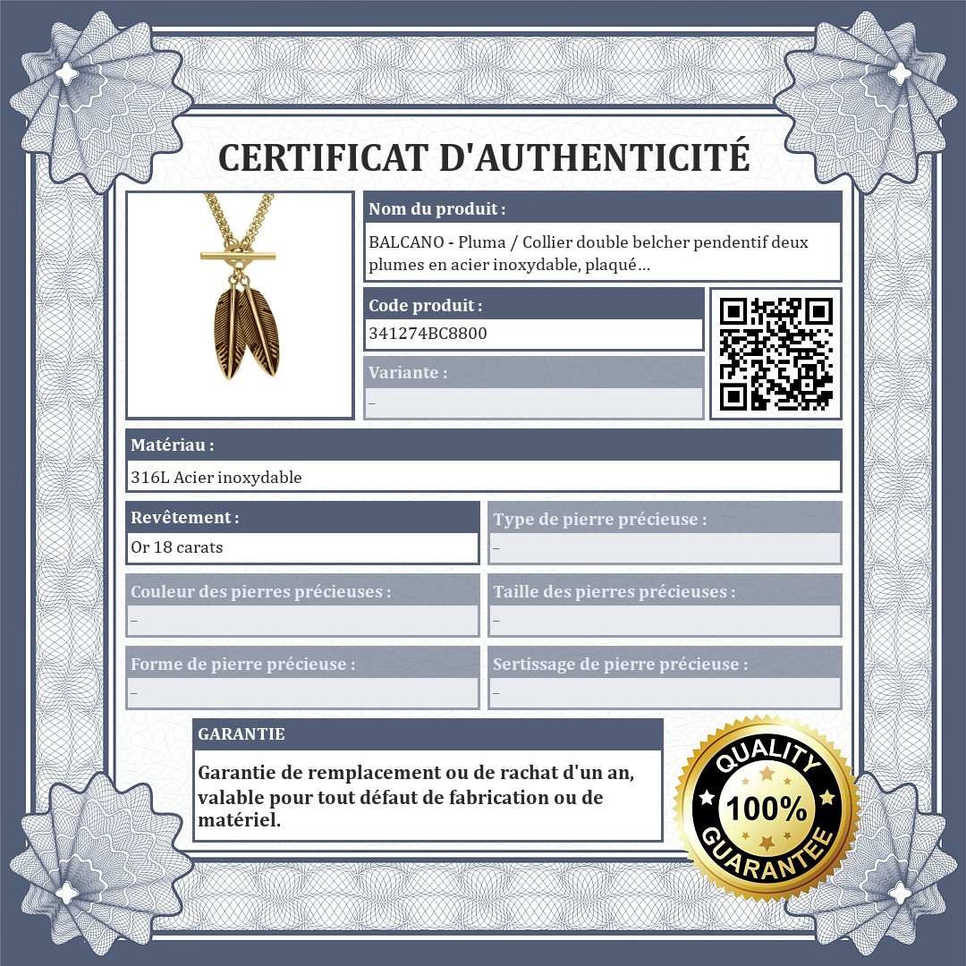 BALCANO - Pluma / Collier double belcher pendentif deux plumes en acier inoxydable, plaqué or 18K
