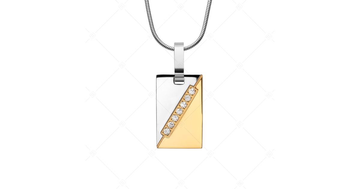 Le mot regal signifie princier, ce qui convient parfaitement à ce modèle magnifique et épuré. Pendantif en acier inoxydable 316L médical antiallergique de haute qualité, poli à la perfection et plaqué or 18K et avec une chaîne de serpent. Les deux couleurs sont séparées par une bande en retrait légèrement inclinée. Serti dans une monture à griffes et décoré de pierres précieuses en zirconium étincelantes.