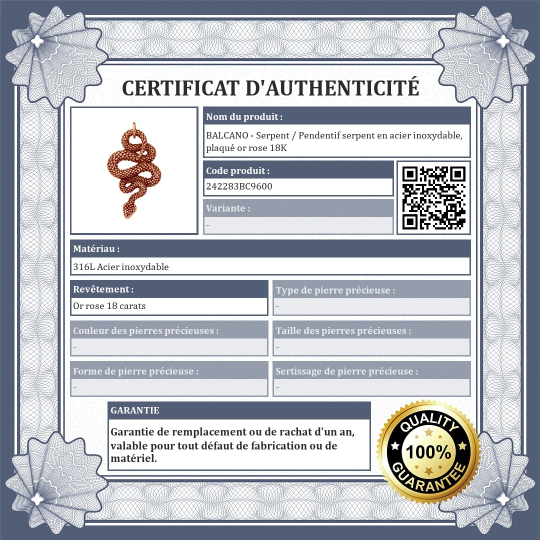 BALCANO - Serpent / Pendentif serpent en acier inoxydable, plaqué or rose 18K