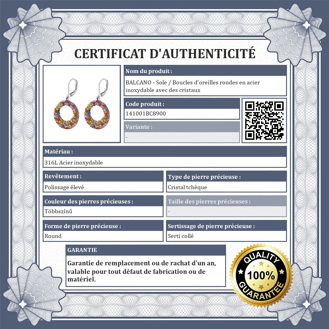 Boucles d'oreilles pendantes rondes serties de cristaux tchèques, multicolore. Bijoux en acier inoxydable de qualité médicale 316L, extrêmement durable, qui ne s'use pas et ne se décolore pas.