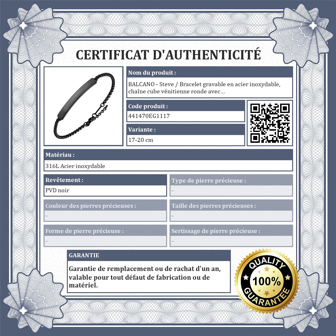 BALCANO - Steve / Bracelet gravable en acier inoxydable, chaîne cube vénitienne ronde avec plaqué PVD noir - 3mm
