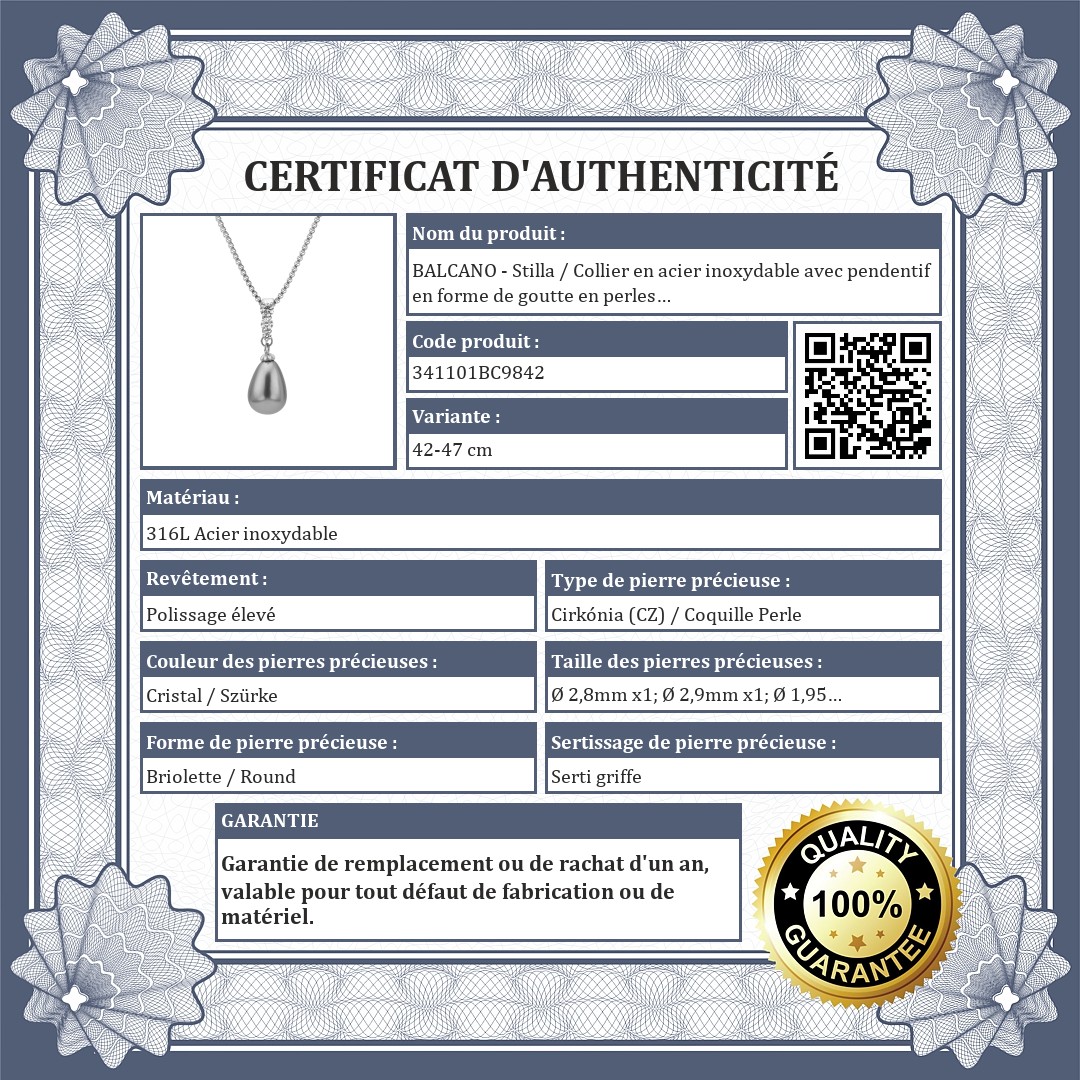 BALCANO - Stilla / Collier en acier inoxydable avec pendentif en forme de goutte en perles de coquillage