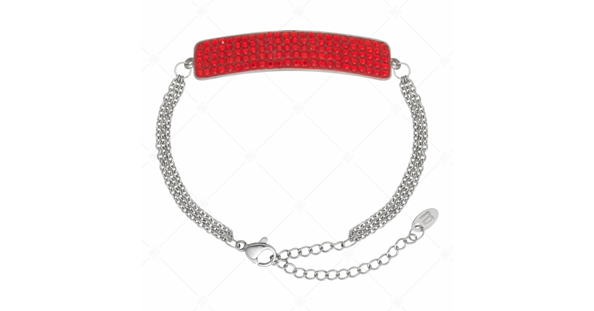 Bijoux antiallergiques, en acier inoxydable 316L, avec hautement polie. Bracelet à fermoir dauphin de taille réglable, composé de trois rangées de chaînes d'ancre aplaties. Une coiffe courbée à la mode, sertie de cristaux tchèques rouges clairs très étincelants.