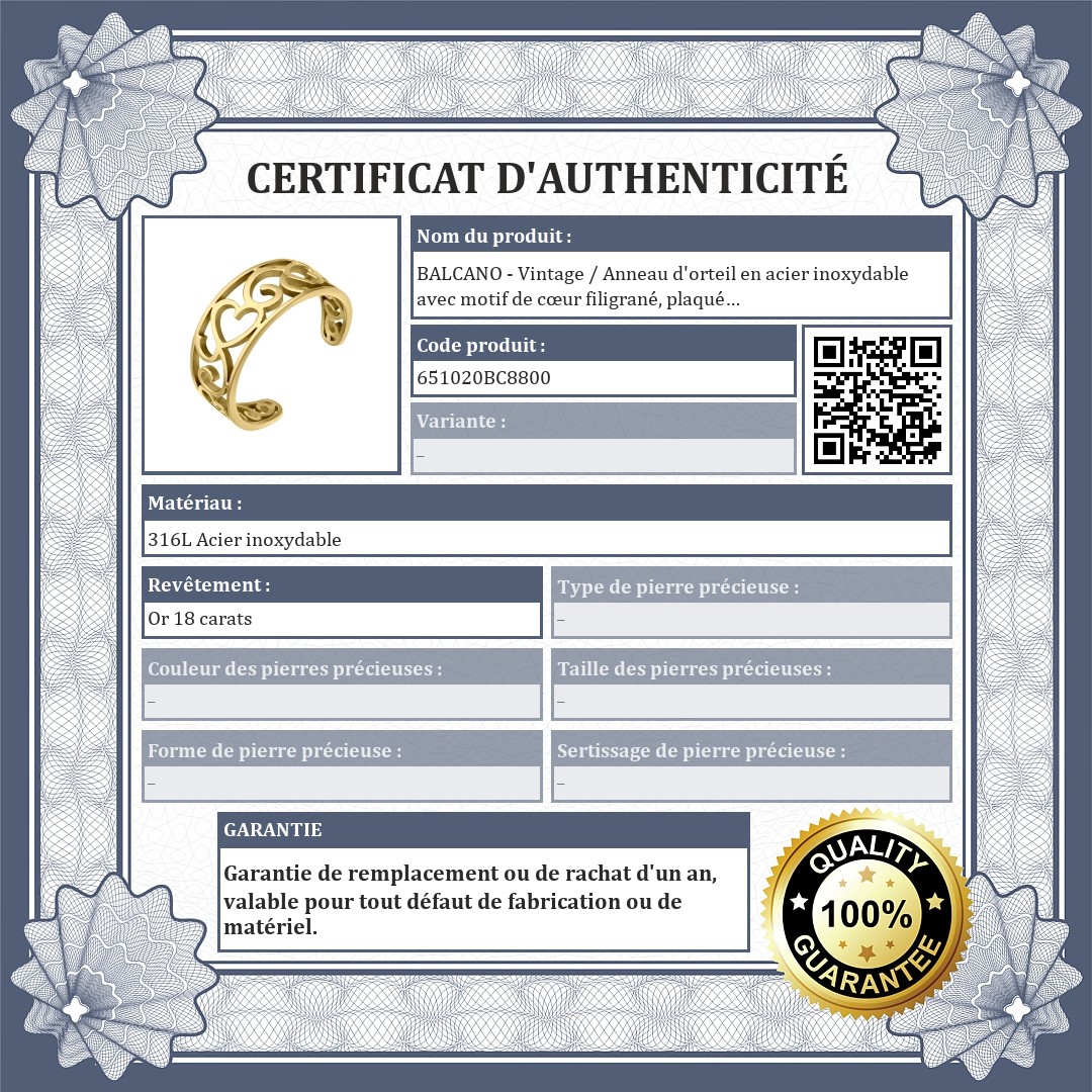 BALCANO - Vintage / Anneau d'orteil en acier inoxydable avec motif de cœur filigrané, plaqué or 18K