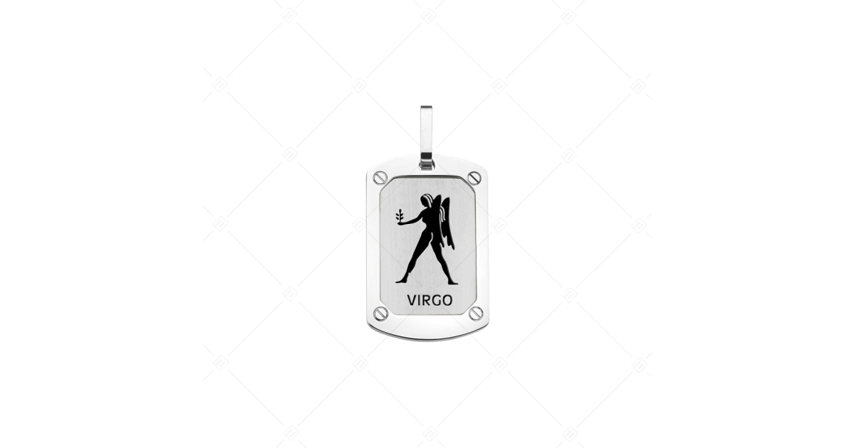 Pendentif zodiacal rectangulaire, antiallergique, en acier inoxydable, décoré de l'image du signe de la Vierge. Les bijoux en acier inoxydable médical 316L sont extrêmement durables grâce à leur matériau. Avec le symbole des signes du zodiaque gravé et peint sur la surface mate et filetée au centre, avec hautement polie.