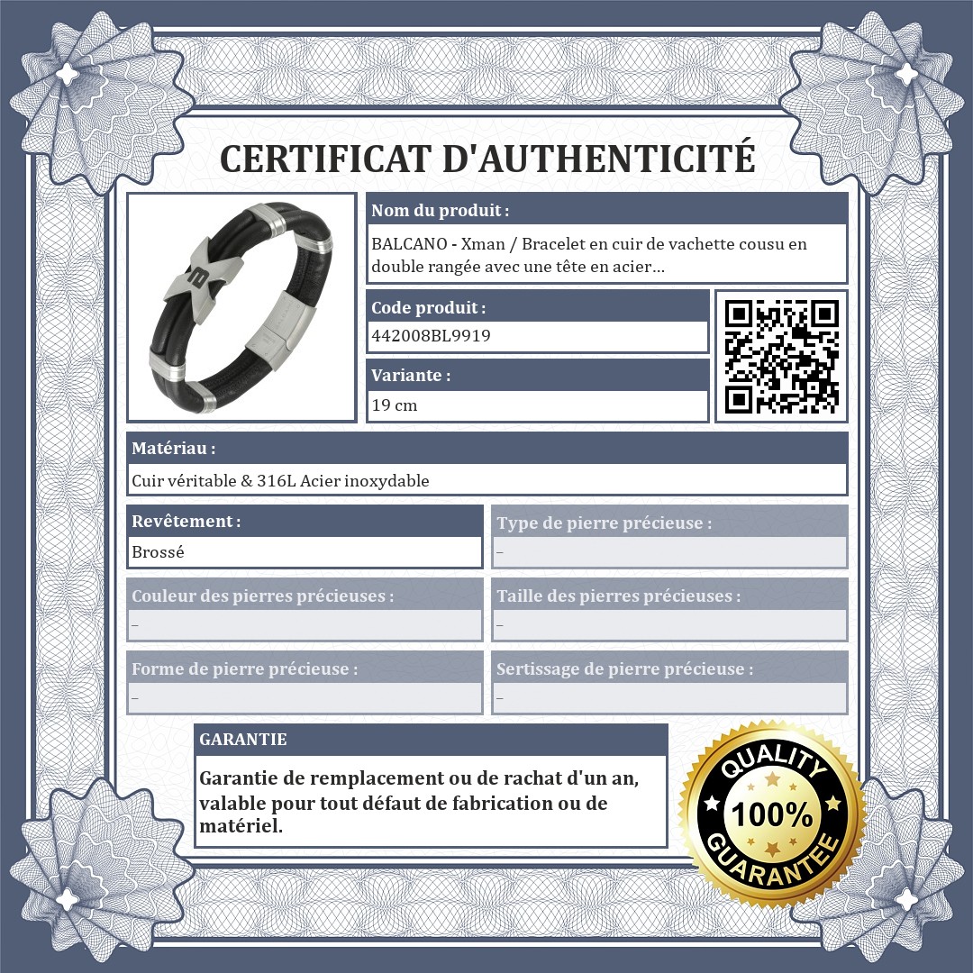 BALCANO - Xman / Bracelet en cuir de vachette cousu en double rangée avec une tête en acier inoxydable en forme de X