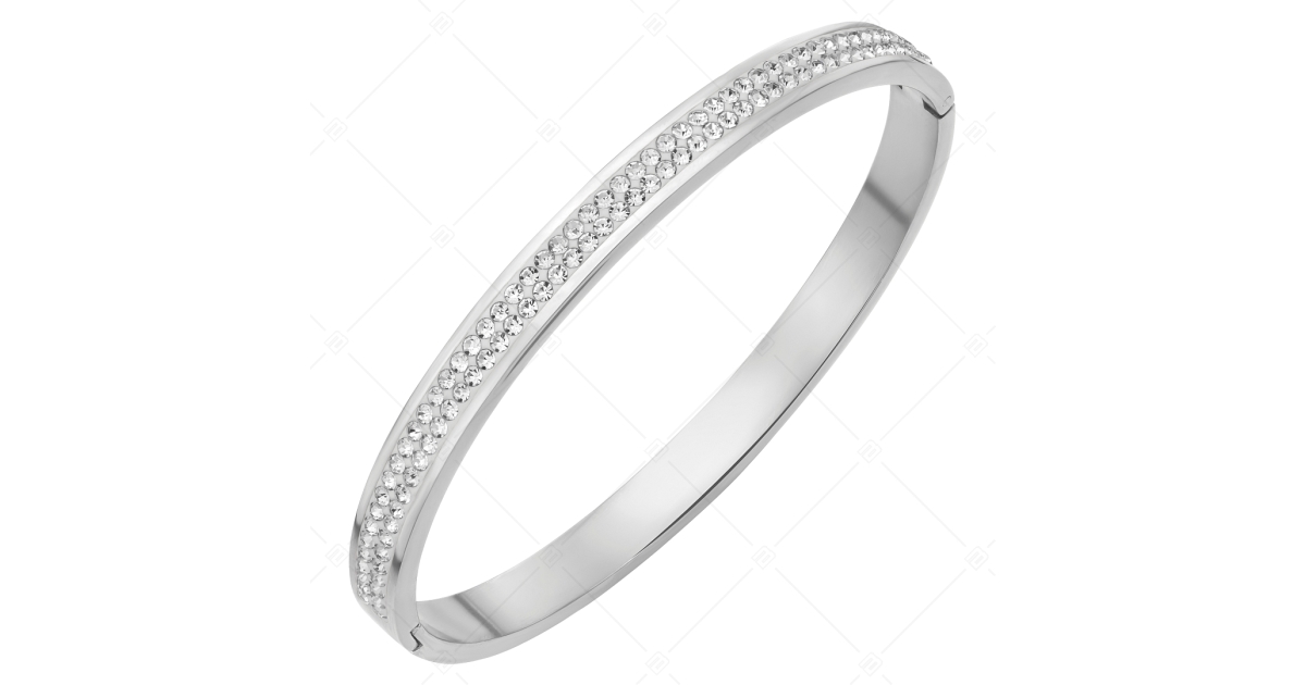 Bracelet décoré d'une double rangée de cristaux tchèques étincelants et transparents. Bijoux en acier inoxydable 316L de qualité médicale, antirouille et hypoallergénique. Accessoire extrêmement durable, couleur argentée avec polissage à haute brillance. Grâce à sa conception, il peut être porté confortablement dans la vie quotidienne.