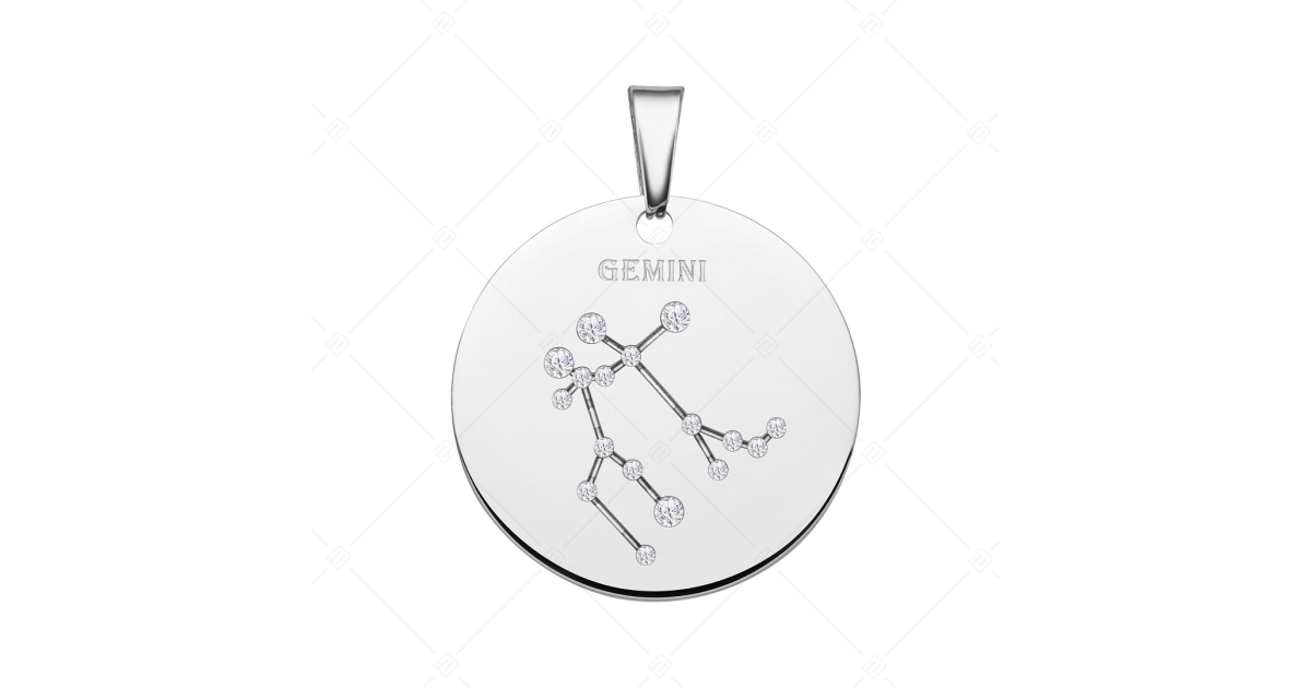 Pendentif horoscope des Gémeaux. Accessoire en acier inoxydable médical 316L, avec hautement polie. La constellation se trouve dans un motif gravé, décoré de pierres de zirconium étincelantes comme de minuscules petites étoiles brillantes.