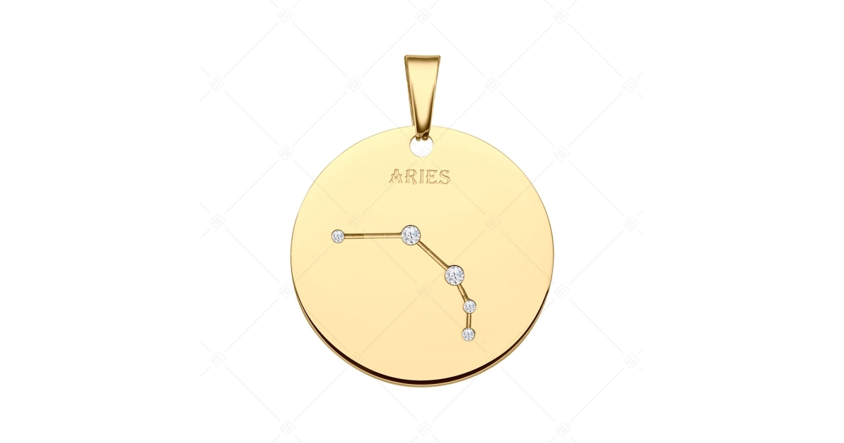 Pendentif horoscope du Bélier. Accessoire en acier inoxydable médical 316L, plaqué or 18K. La constellation se trouve dans un motif gravé, décoré de pierres de zirconium étincelantes comme de minuscules petites étoiles brillantes.