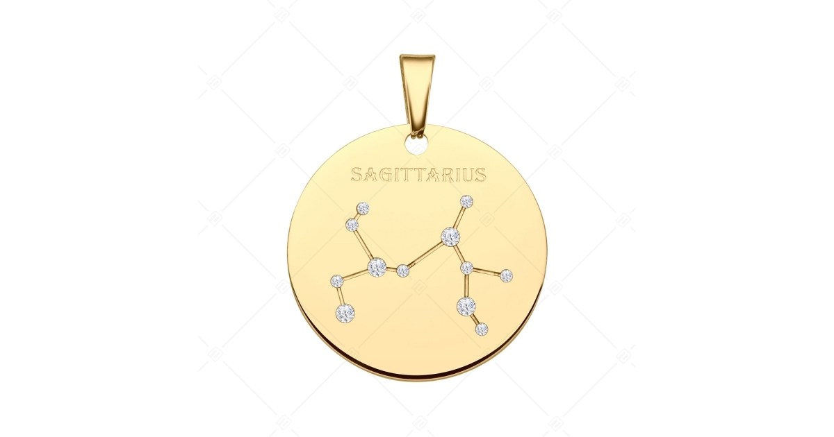 Pendentif horoscope du Sagittaire. Accessoire en acier inoxydable médical 316L, plaqué or 18K. La constellation se trouve dans un motif gravé, décoré de pierres de zirconium étincelantes comme de minuscules petites étoiles brillantes.