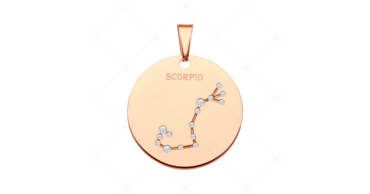Pendentif horoscope du Scorpion. Accessoire en acier inoxydable médical 316L, plaqué or rose 18K. La constellation se trouve dans un motif gravé, décoré de pierres de zirconium étincelantes comme de minuscules petites étoiles brillantes.