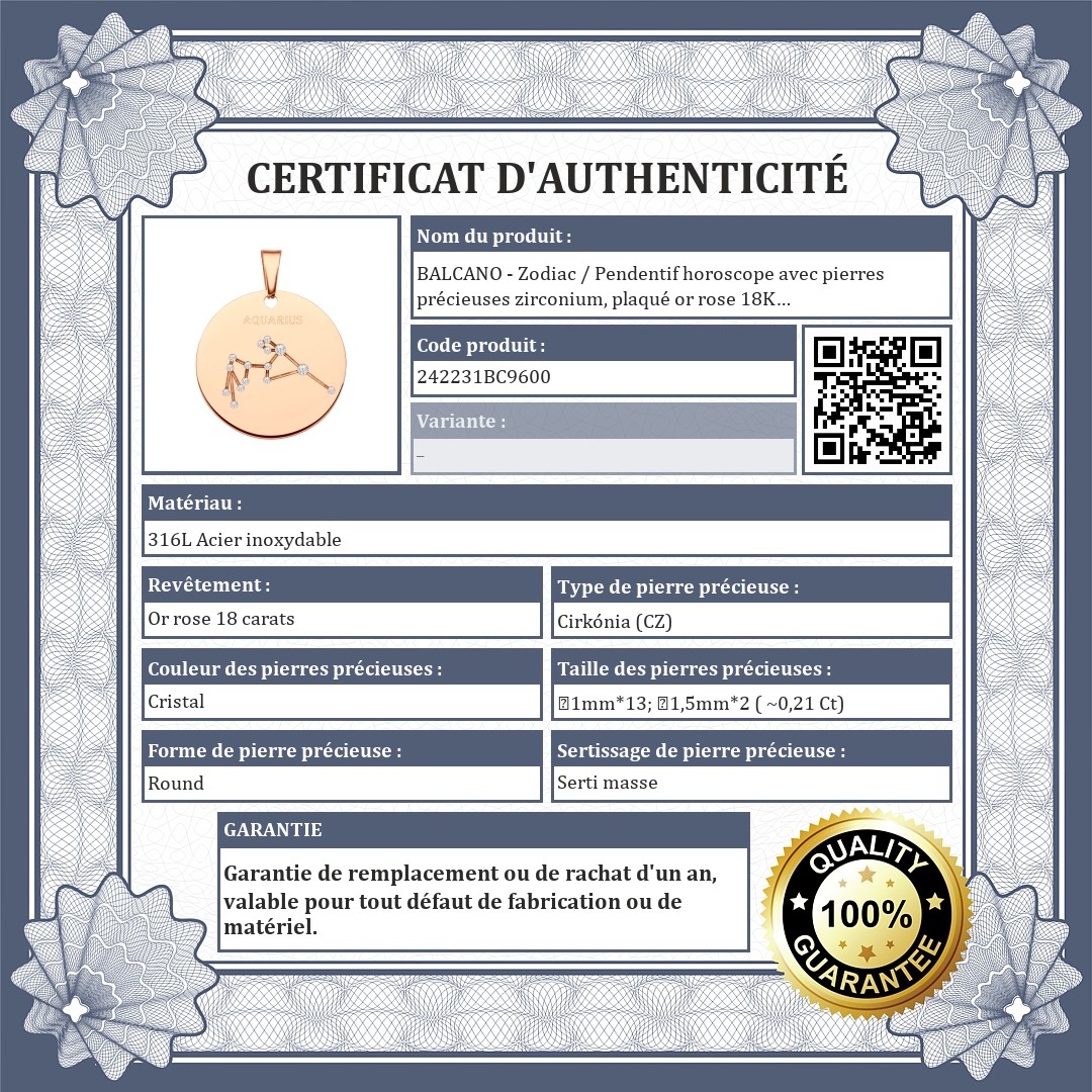 BALCANO - Zodiac / Pendentif horoscope avec pierres précieuses zirconium, plaqué or rose 18K - Verseau