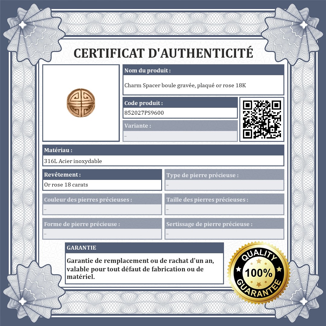 Charm Spacer en forme de boule, décorée de motifs gravés tout autour. Accessoire en acier inoxydable médical 316L, plaqué or rose 18K. Les spacers permettent d'éviter que les charms et les perles ne glissent de votre bracelet.