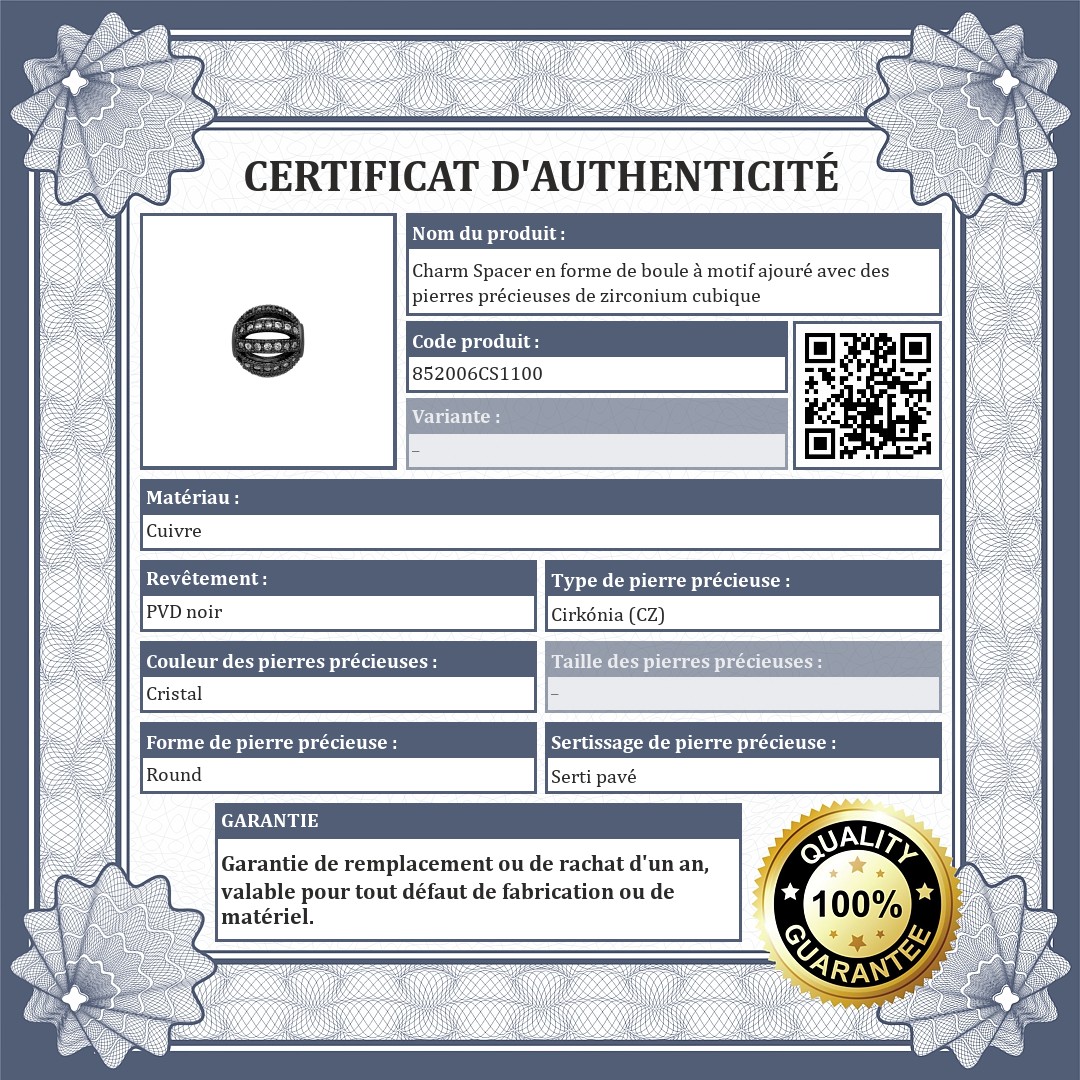 Charm spacer creux en forme de boule. Accessoire spécialement conçu, orné en cercle des cristaux clairs de zirconium cubique tout autour. Fabriqué en cuivre avec revêtement PVD noir chromé. Les spacers permettent à vos charms et perles de ne pas glisser du bracelet.