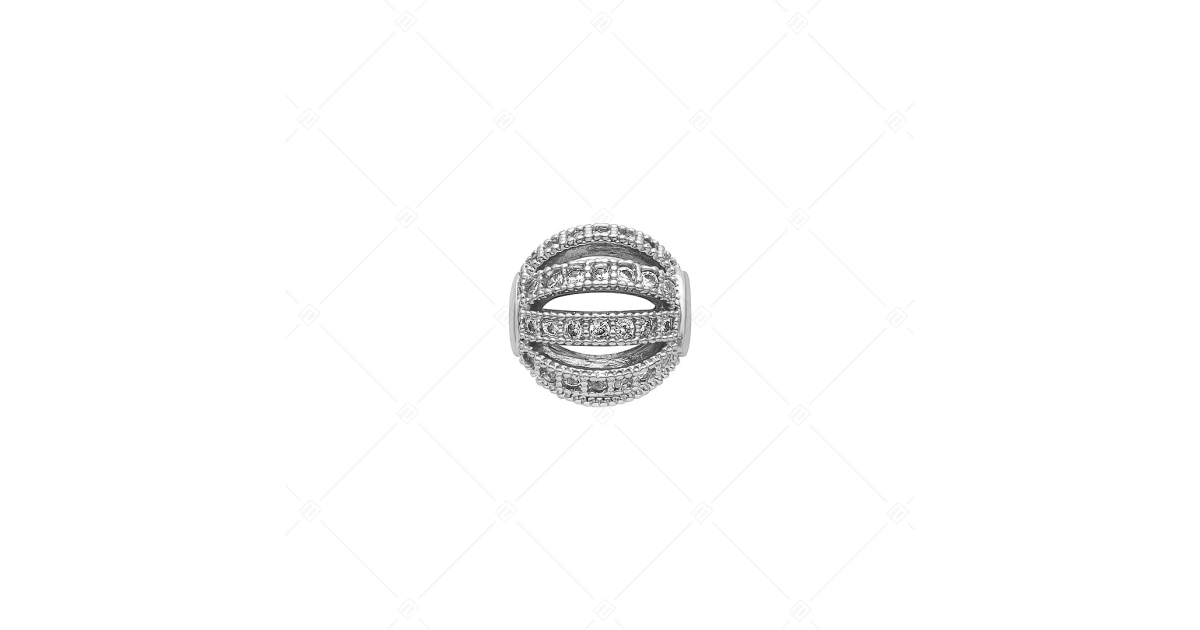 Charm spacer creux en forme de boule. Accessoire spécialement conçu, orné en cercle des cristaux clairs de zirconium cubique tout autour. Accessoires en cuivre plaqué argent 925 Sterling. Les spacers permettent à vos charms et perles de ne pas glisser du bracelet.