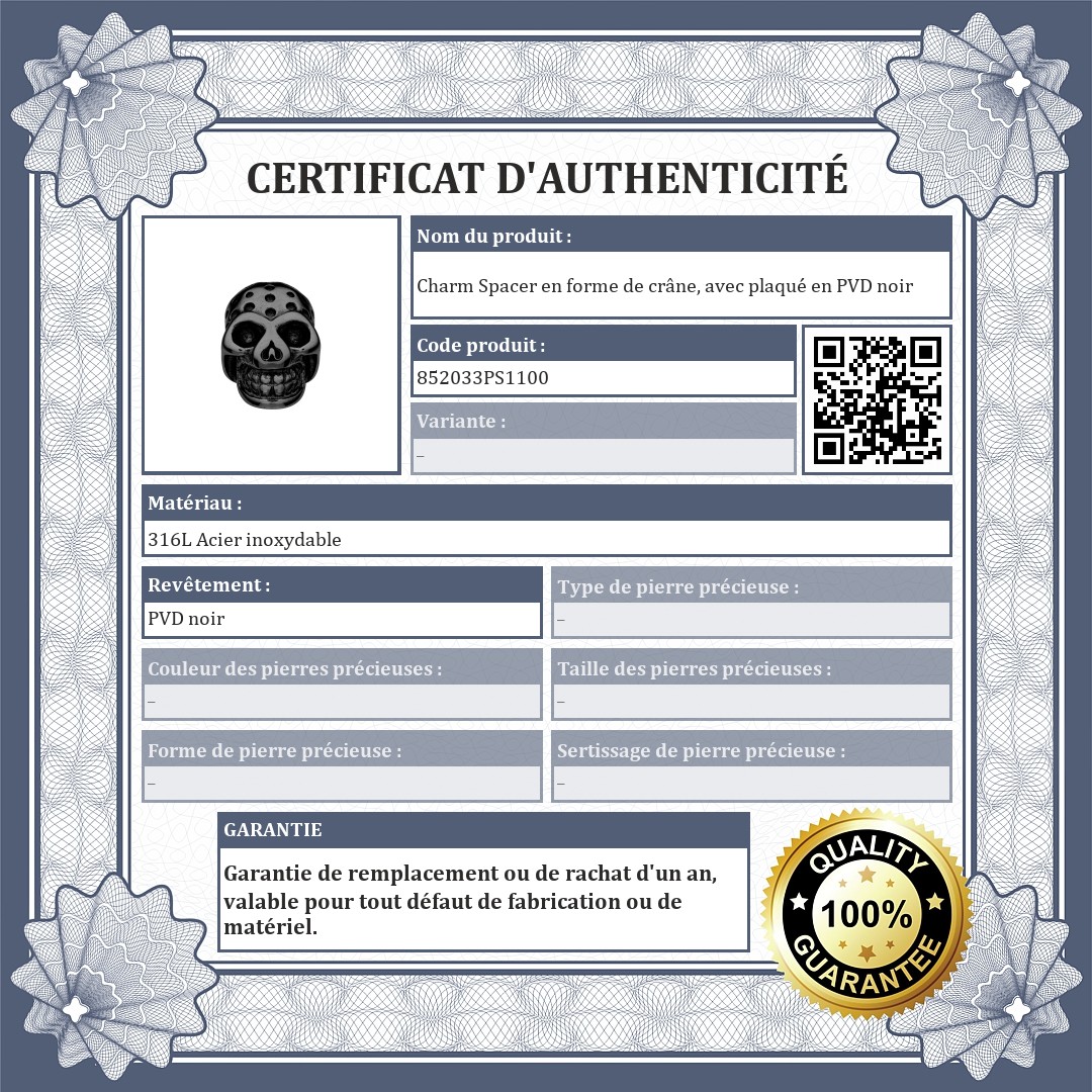 Charm Spacer en forme de crâne avec des indentations sur la surface. Accessoire en acier inoxydable de qualité médicale 316L, avec plaqué en PVD noir chromé. Les spacers permettent d'éviter que les charms et les perles ne glissent de votre bracelet.