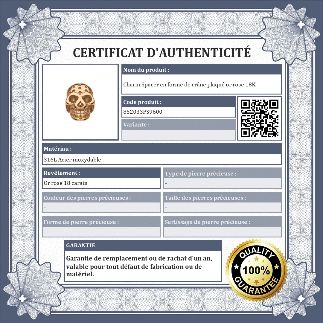 Charm Spacer en forme de crâne avec des indentations sur la surface. Accessoire en acier inoxydable de qualité médicale 316L, plaqué or rose 18K. Les spacers permettent d'éviter que les charms et les perles ne glissent de votre bracelet.