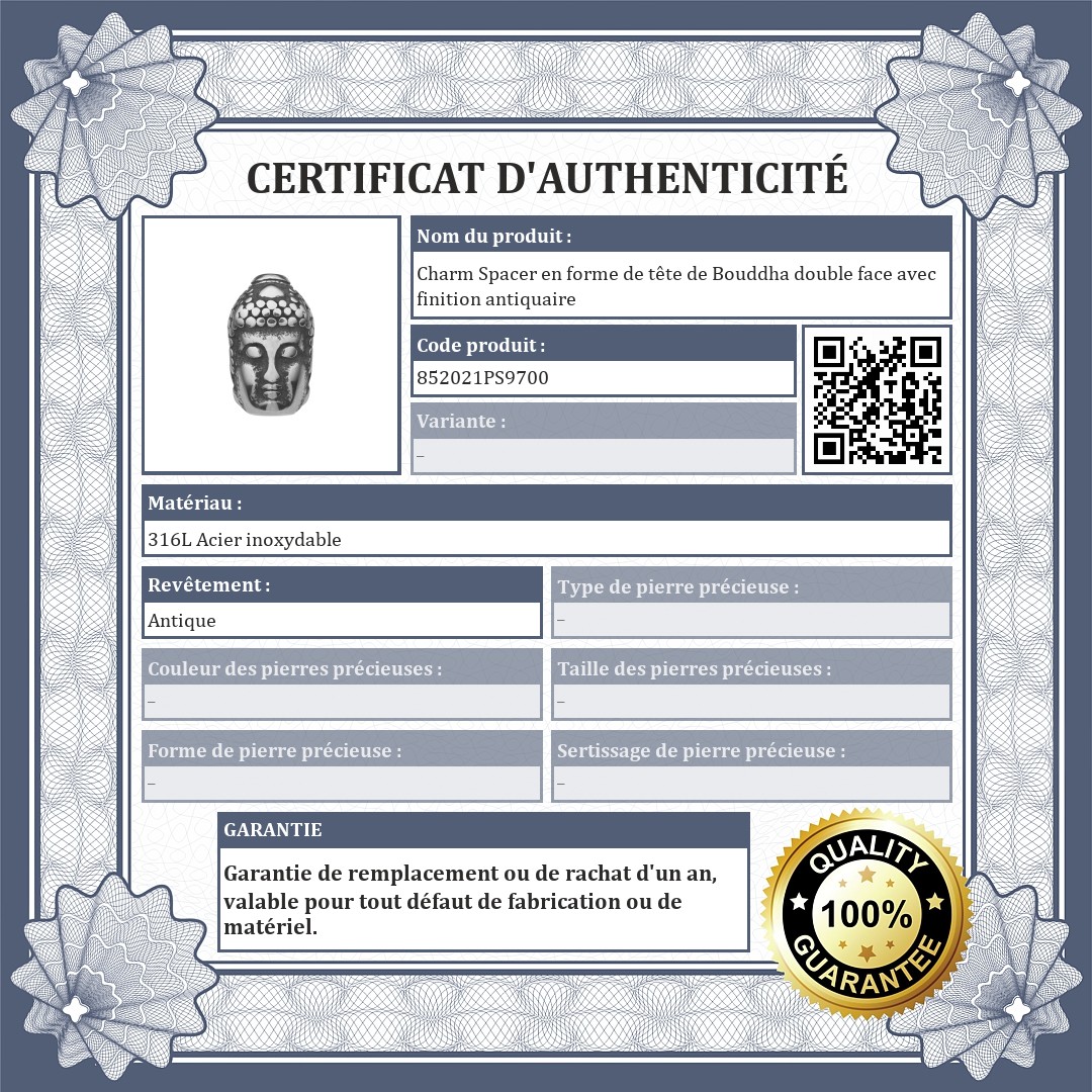 Charm spacer en forme de tête de Bouddha. Fabriqué en acier inoxydable de qualité médicale 316L, avec une surface antiquaire pour un effet spécial. De haute qualité, il ne s'usera pas et ne ternira pas à l'usage. Les spacers permettent d'éviter que les charms et les perles ne glissent de votre bracelet.