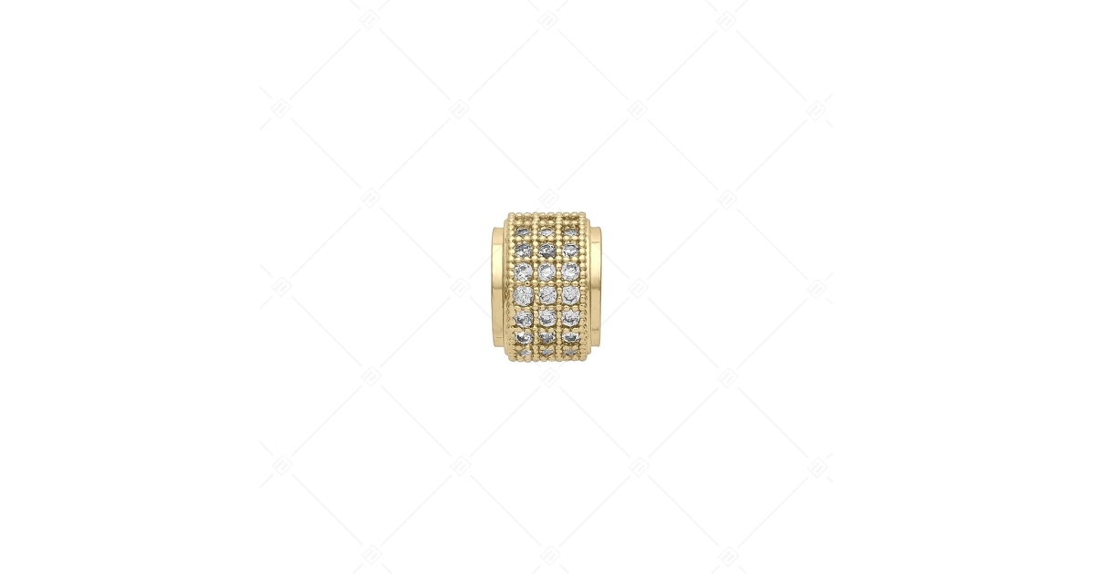 Charm spacer rond, épais, ornée en cercle, en plusieurs rangées, de cristaux de zirconium cubique clairs. Fabriqué en cuivre plaqué or 18K. Les spacers permettent à vos charms et perles de ne pas glisser sur le bracelet.