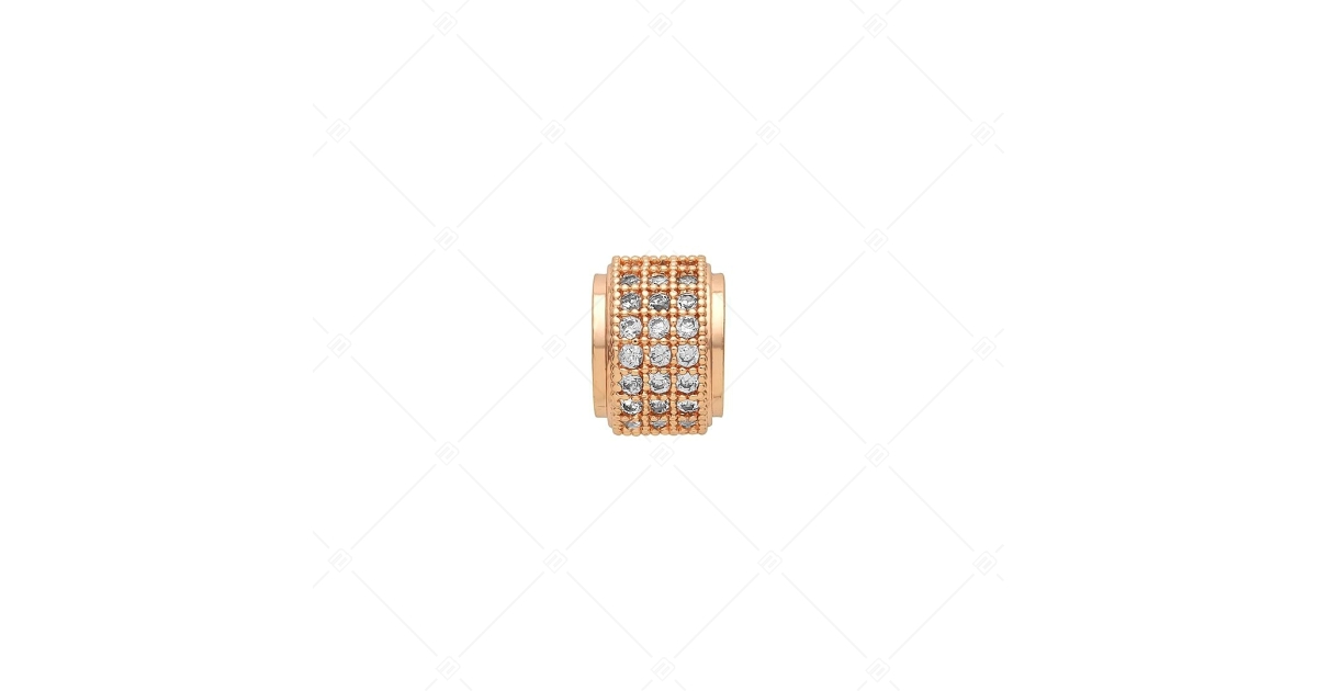 Charm spacer rond, épais, ornée en cercle, en plusieurs rangées, de cristaux de zirconium cubique clairs. Fabriqué en cuivre plaqué or rose 18K. Les spacers permettent à vos charms et perles de ne pas glisser sur le bracelet.