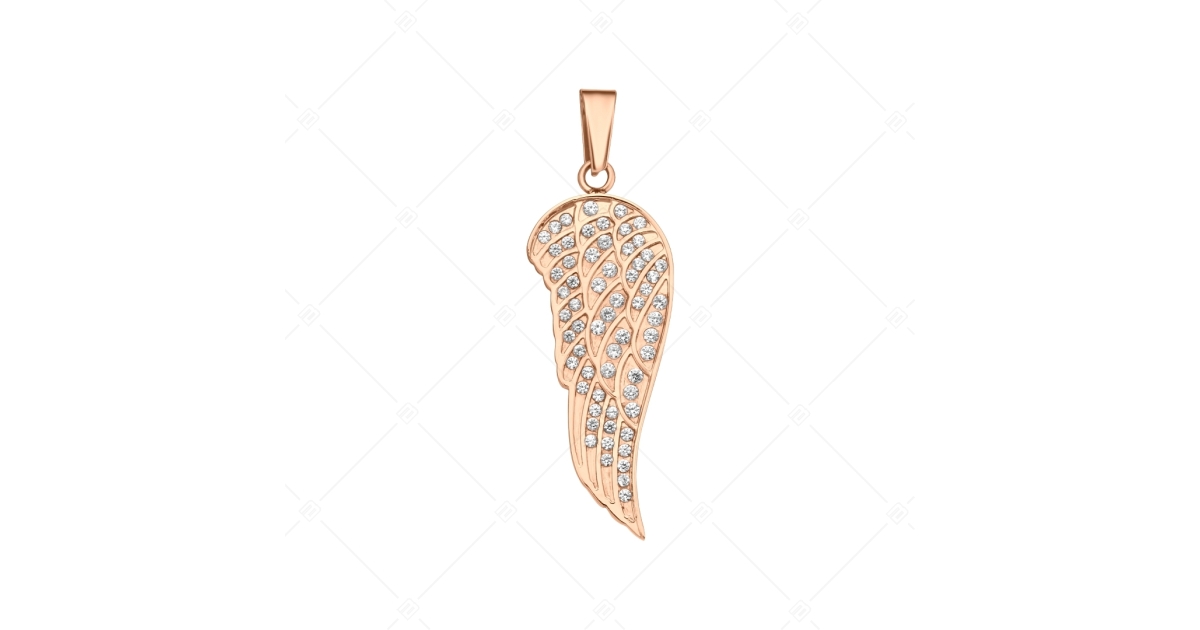 Pendant in the shape of an angel's wing, set with cubic zirconia gemstones. 316L medical grade stainless steel jewelry, 18K rose gold plated. The material is extremely durable and will not wear or tarnish under normal everyday use.