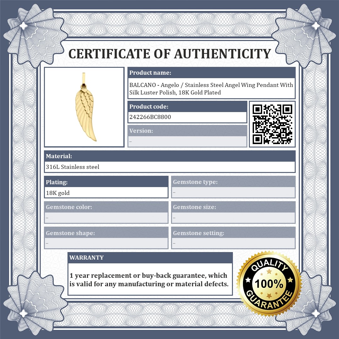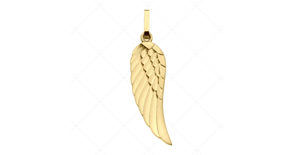 Angel wing pendant in 316L medical stainless steel with silk polish finish and 18K gold plated. The polishing gives the pendant a pleasing light effect. Thanks to its material, it is allergy-free, non-abrasive and non-fraying.