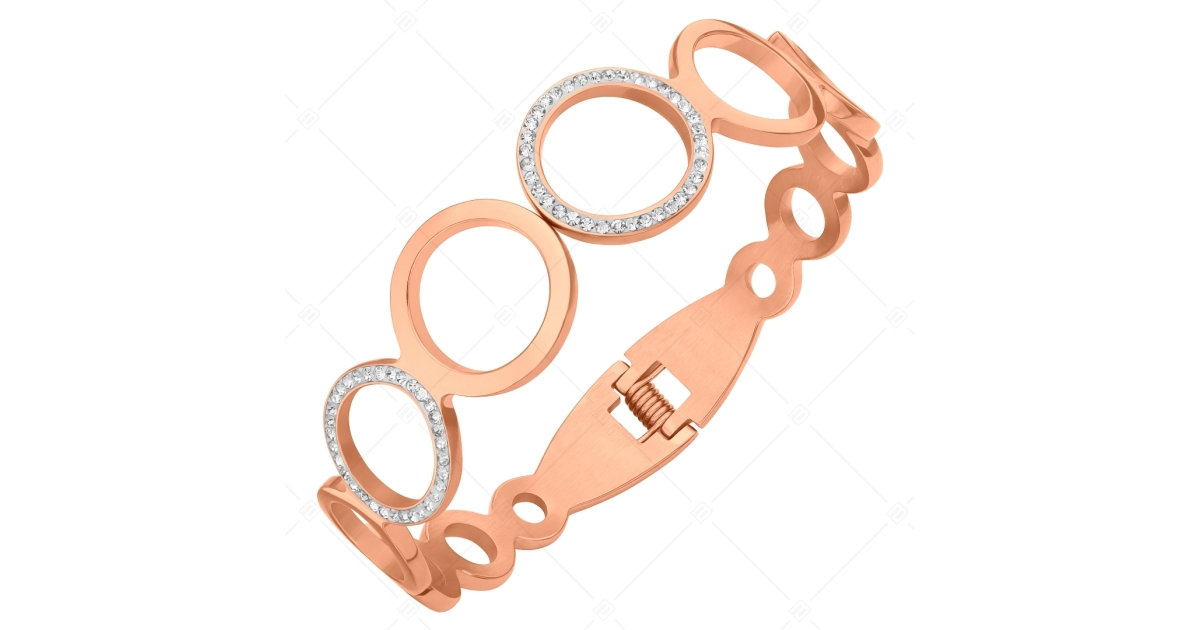 316L anti-allergy stainless steel bracelet with circular pattern, high polished and 18K rose gold plated. Decorated with a sparkling Czech crystal inlaid. Thanks to its material, it will not wear or discolour, and it will not be damaged by water. Unique and comfortable jewelry.