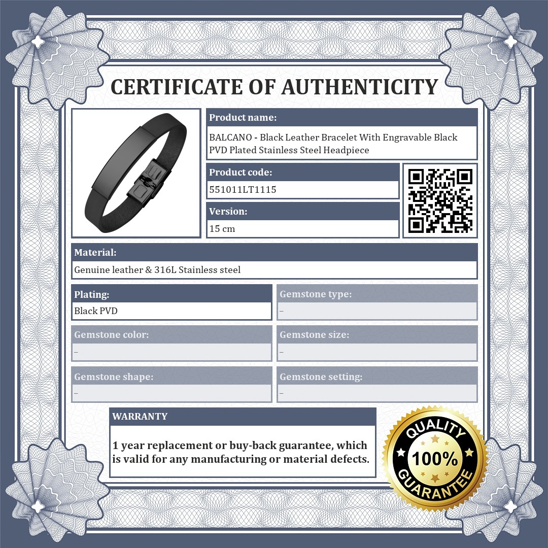 BALCANO - Black Leather Bracelet With Engravable Black PVD Plated Stainless Steel Headpiece
