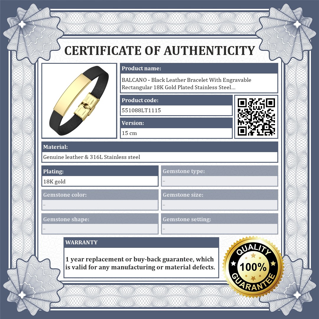 BALCANO - Black Leather Bracelet With Engravable Rectangular 18K Gold Plated Stainless Steel Headpiece