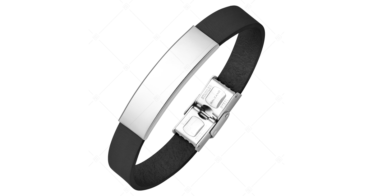 BALCANO - Black Leather Bracelet With Engravable Rectangular Stainless Steel Headpiece