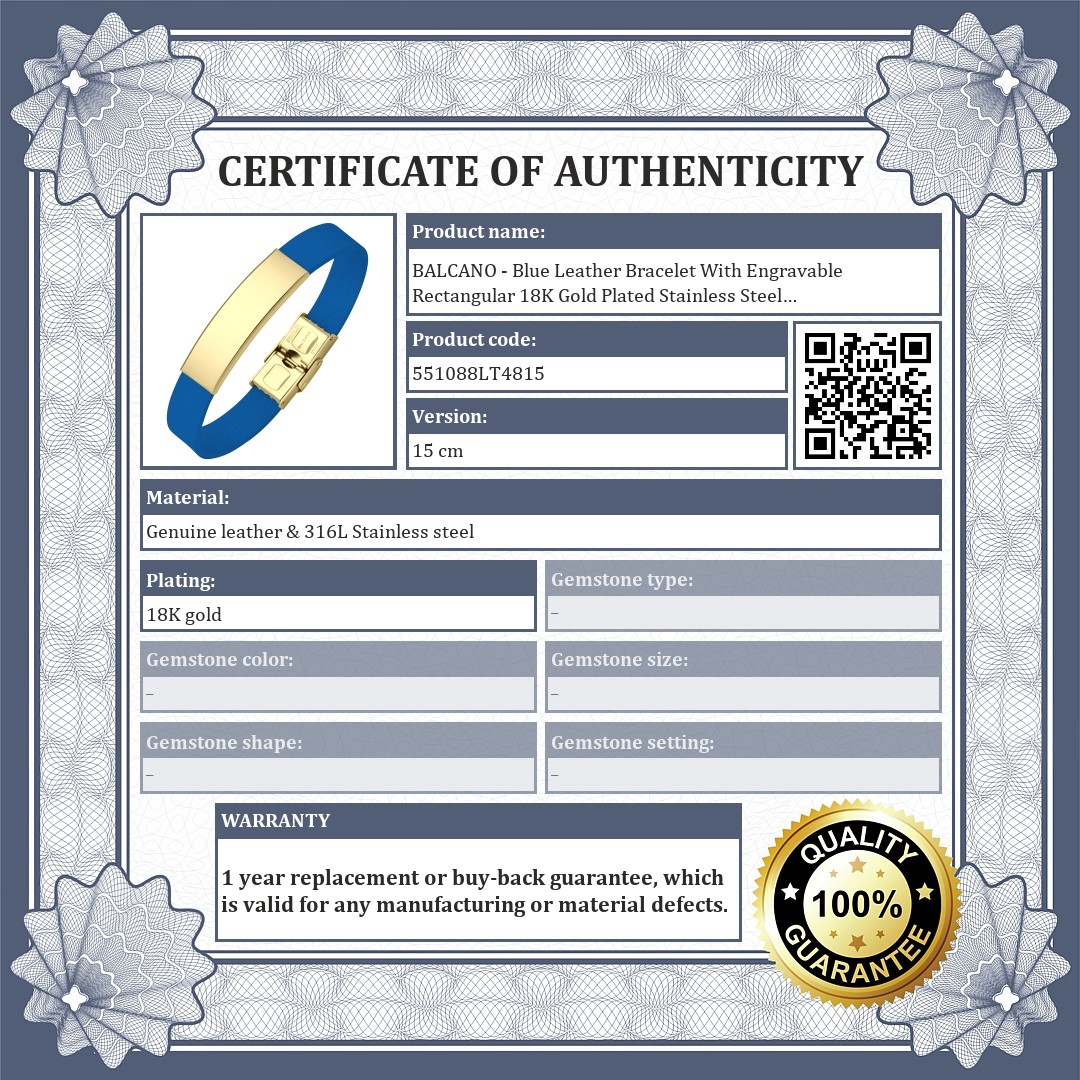 BALCANO - Blue Leather Bracelet With Engravable Rectangular 18K Gold Plated Stainless Steel Headpiece
