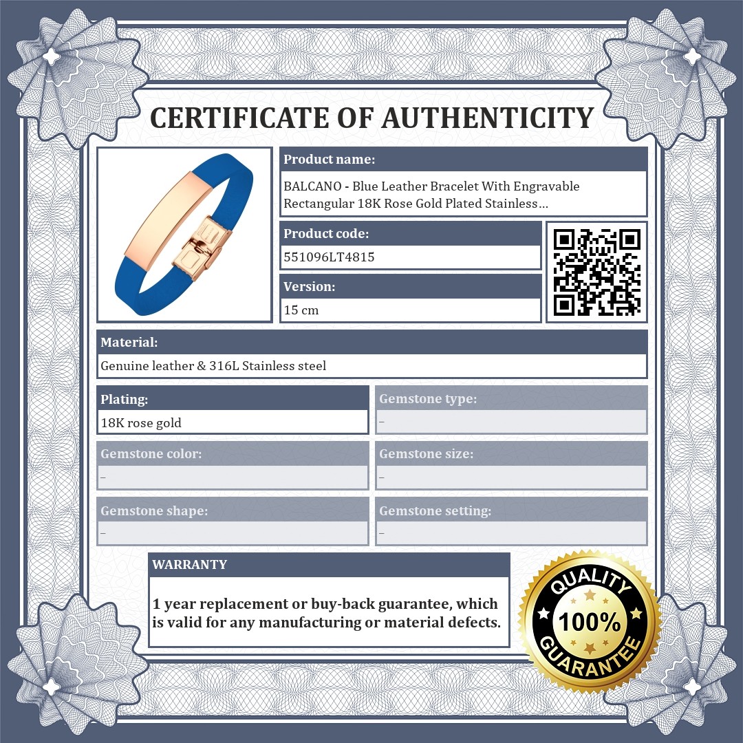 BALCANO - Blue Leather Bracelet With Engravable Rectangular 18K Rose Gold Plated Stainless Steel Headpiece