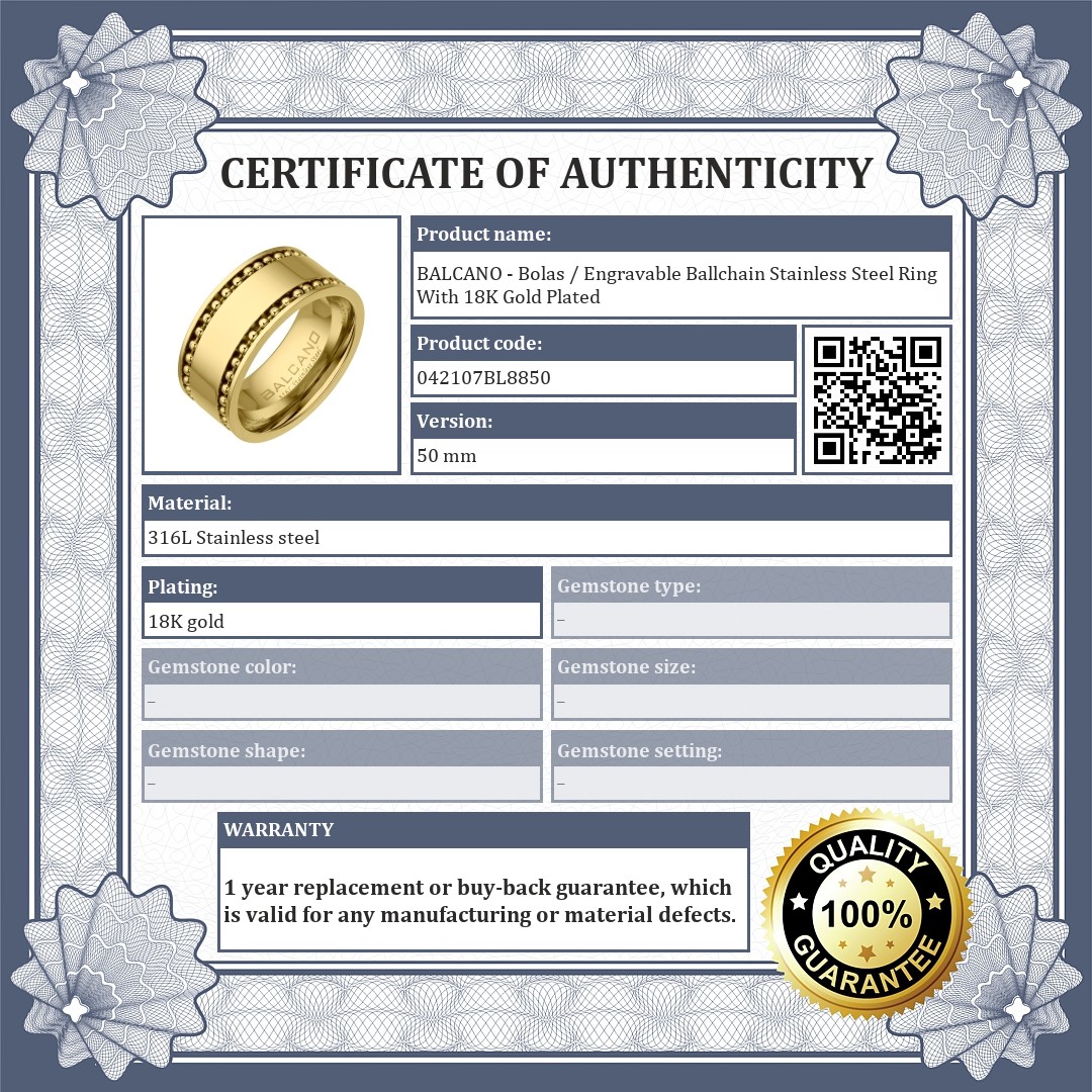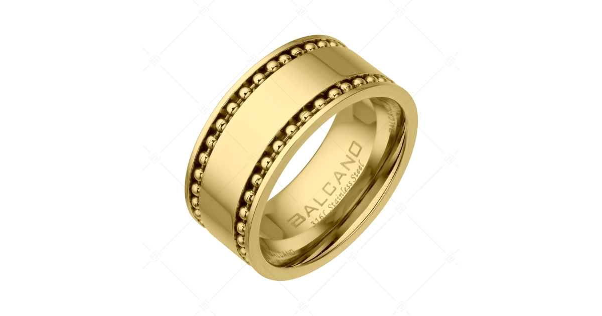 Anti-allergy, 316L stainless steel ring, with 18K gold plated. High quality steel jewelry, which is suitable for engraving individual texts and motifs. Both sides of the ring are decorated with an inlaid ballchain.