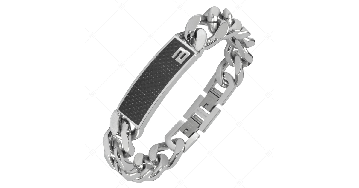 Stainless steel curb chain bracelet with black carbon fibre inlaid rectangular headpiece and BALCANO logo. Premium quality, extremely durable 316L medical stainless steel jewelry, which is made of a material that will not wear or discolour.
