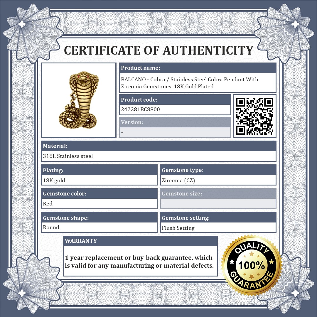 BALCANO - Cobra / Stainless Steel Cobra Pendant With Zirconia Gemstones, 18K Gold Plated