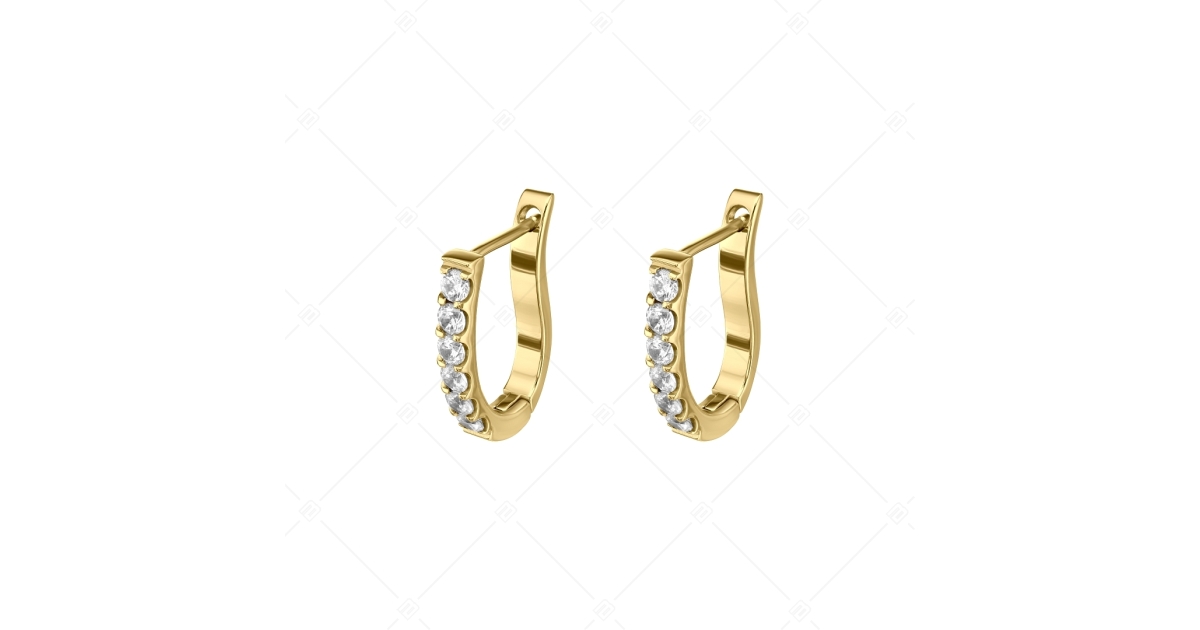 316L stainless steel horseshoe shaped earrings with 18K gold plated and cubic zirconia gemstones. Made of allergy-free metal. Thanks to its material, it does not discolour, does not wear out and is not sensitive to medicinal water or detergents. A fashionable piece of jewellery for everyday wear.