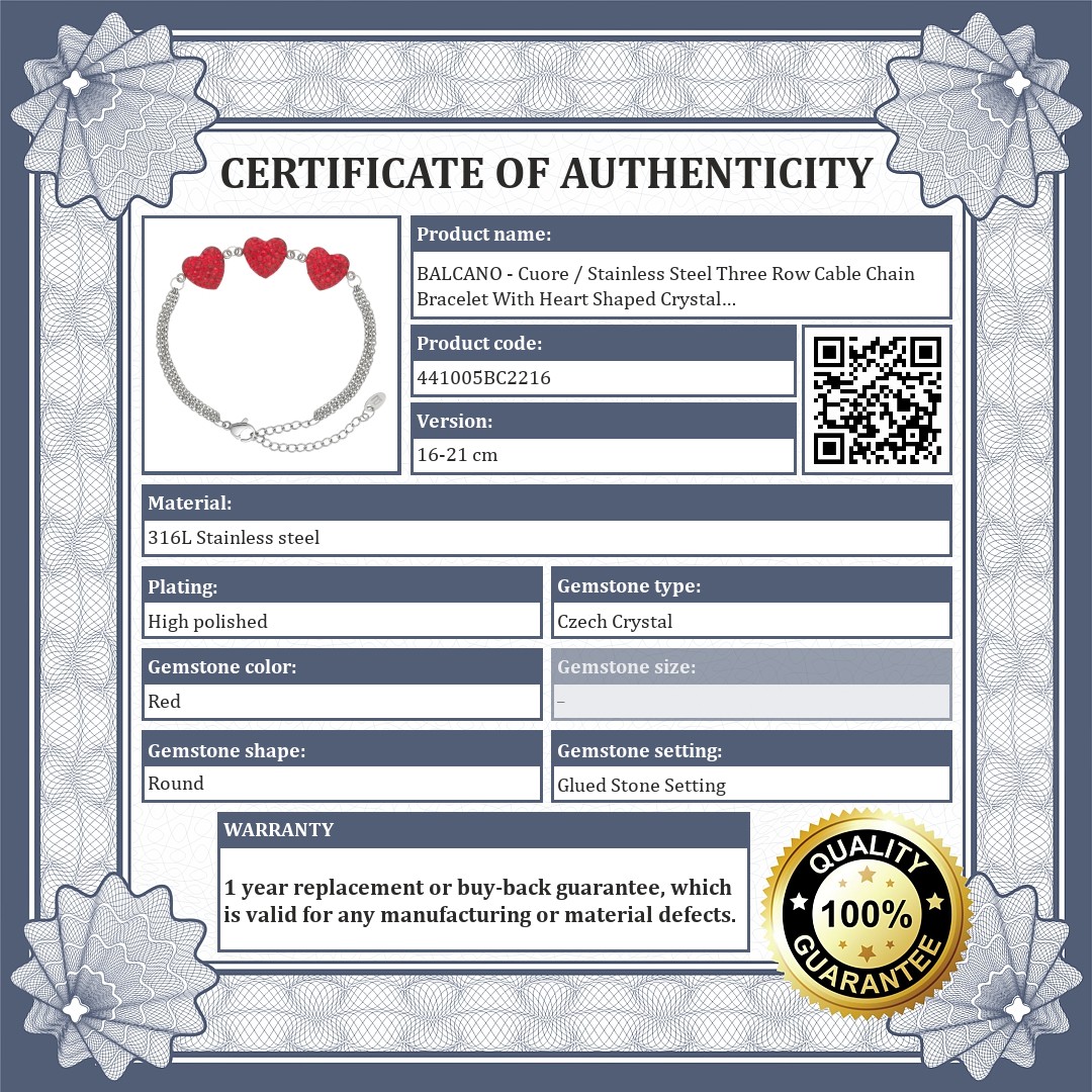 BALCANO - Cuore / Stainless Steel Three Row Cable Chain Bracelet With Heart Shaped Crystal Charms