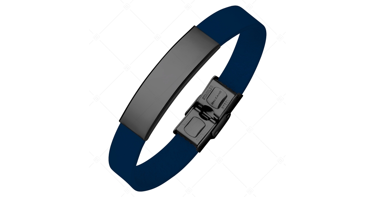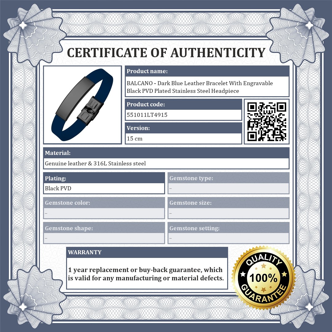 BALCANO - Dark Blue Leather Bracelet With Engravable Black PVD Plated Stainless Steel Headpiece
