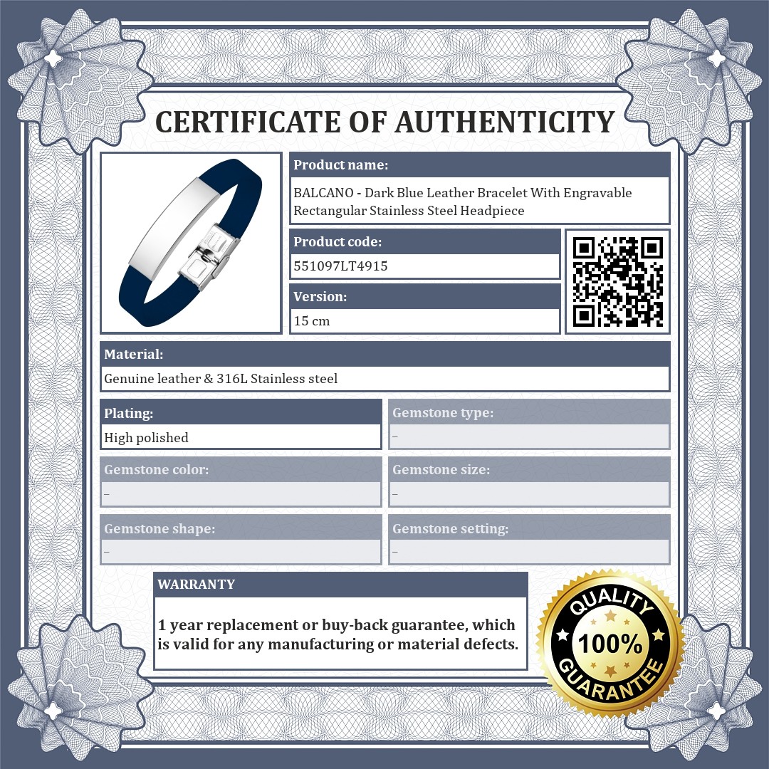 BALCANO - Dark Blue Leather Bracelet With Engravable Rectangular Stainless Steel Headpiece