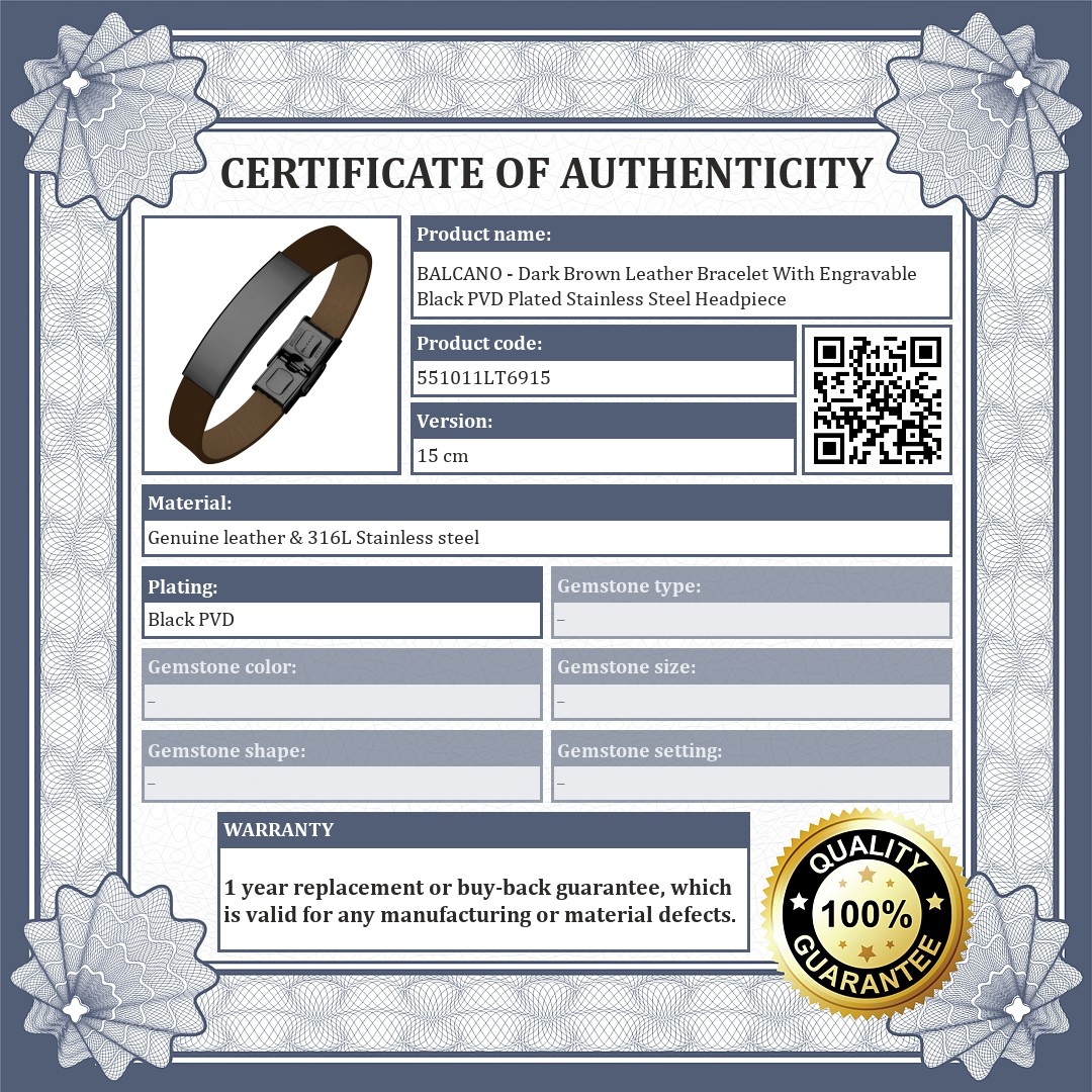 BALCANO - Dark Brown Leather Bracelet With Engravable Black PVD Plated Stainless Steel Headpiece