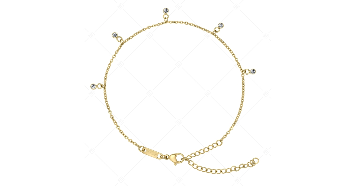Flattened cable chain anklet with round cubic zirconia crystals. 316L medical grade stainless steel jewelry, 18K gold plated. A fashionable and elegant accessory, which thanks to its material is anti- allergy, does not wear or tarnish with use.