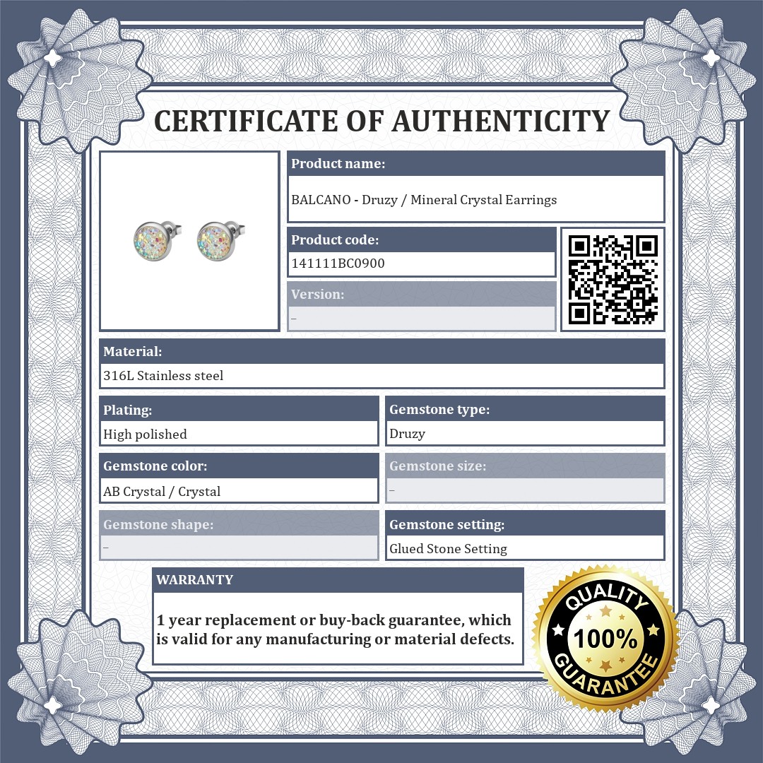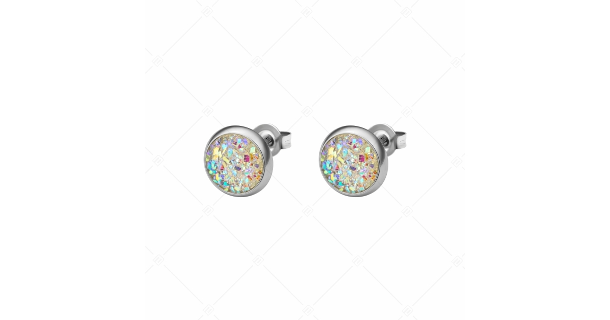 Anti-allergy, medical 316L stainless steel, round stud earrings with high-gloss polish and butterfly clasp. A headpiece set with special shimmering druzy crystals makes it truly unique. Druzy crystal is a natural form of minerals that occur naturally.