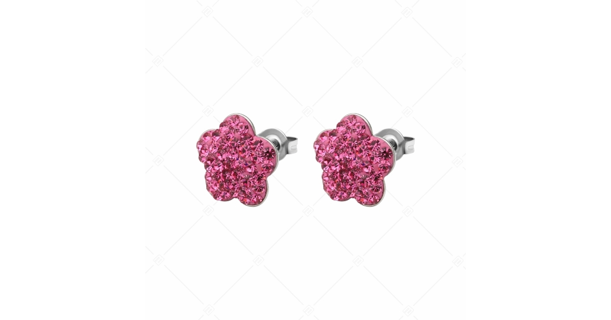 Flower shaped stud earrings set with pink Czech crystals. 316L medical stainless steel jewelry that is extremely durable thanks to its material.