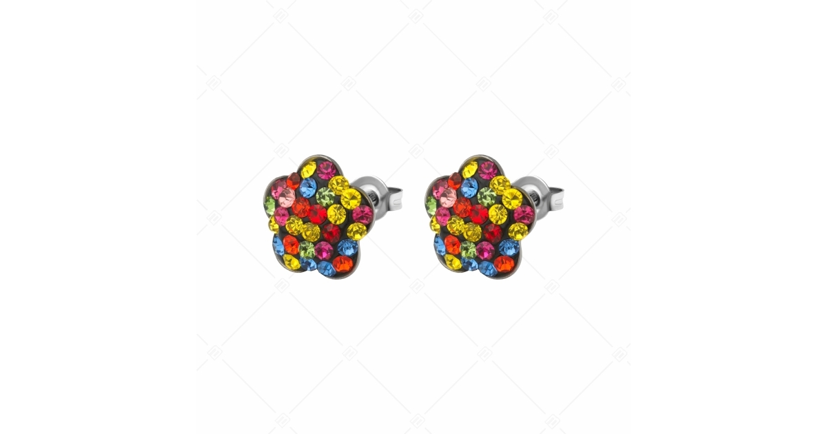 Flower shaped stud earrings set with multicolor Czech crystals. 316L medical stainless steel jewelry that is extremely durable thanks to its material.