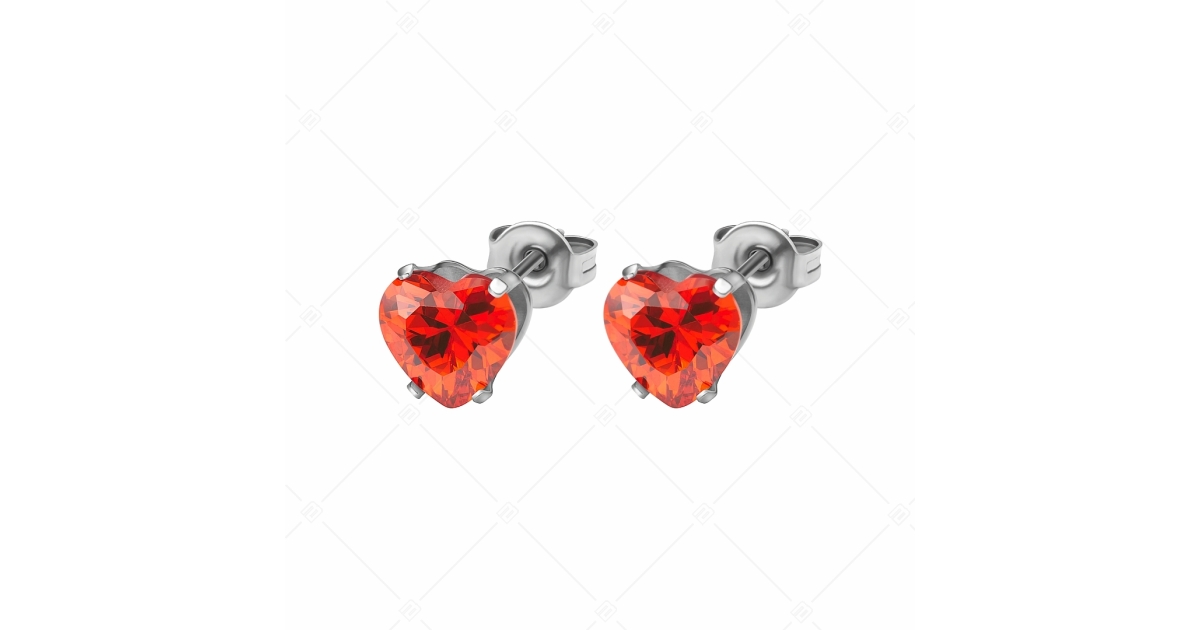 Red coloured, heart-shaped cubic zirconia gemstone stud earrings in size 8 mm. 316L medical grade stainless steel jewelry that will not wear or discolour thanks to its material.