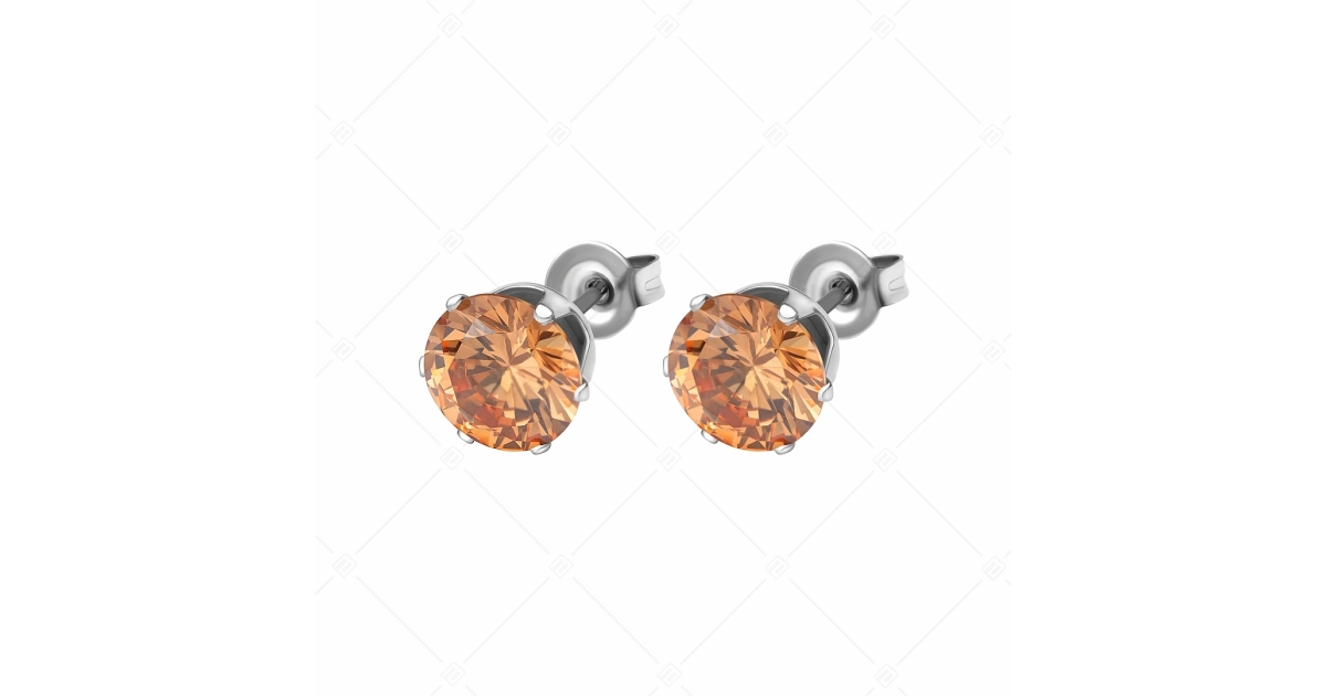 Champagne coloured, round cubic zirconia gemstone stud earrings in 6 mm and 8 mm sizes. 316L medical grade stainless steel jewelry that will not wear or discolour due to its material.