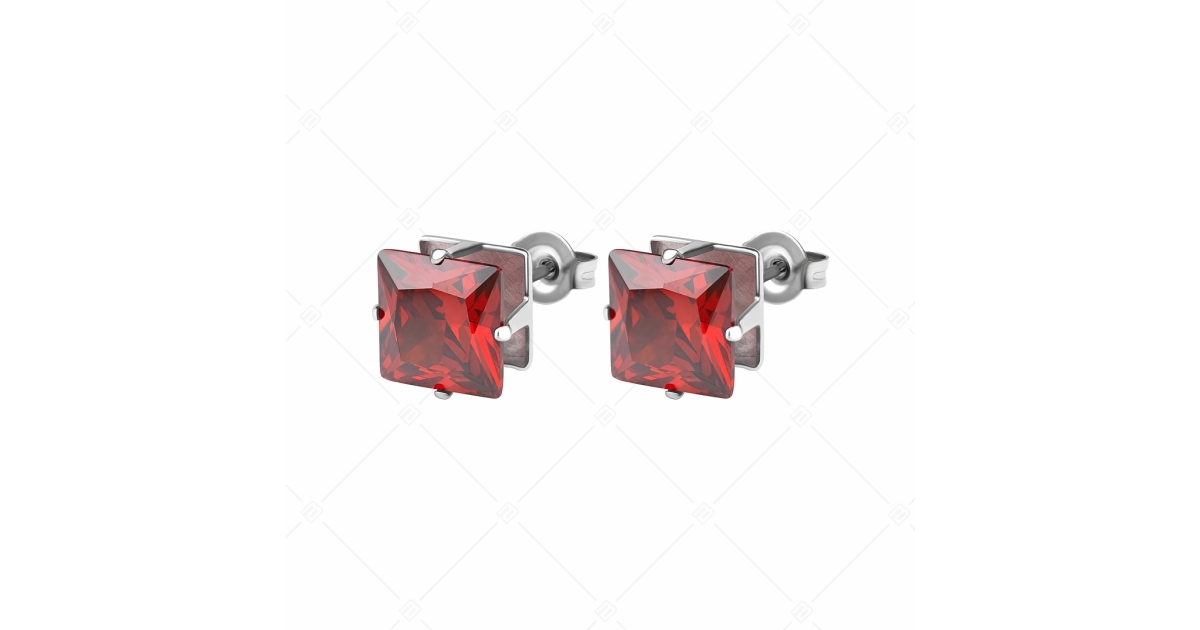 Garnet red colour, square cubic zirconia gemstone stud earrings in 6 mm and 8 mm sizes. 316L medical grade stainless steel jewelry, which does not wear or discolour thanks to it's material.